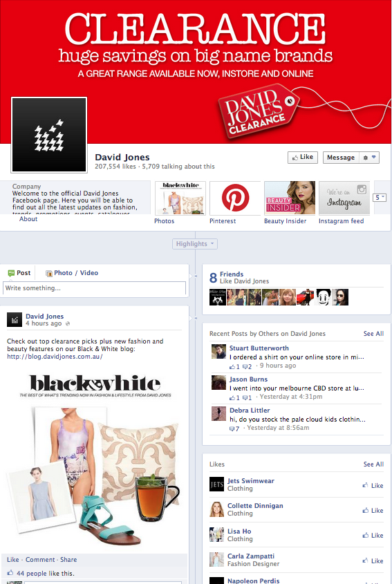 David Jones have certainly been paying attention to their online presence in recent years, especially with the opening of their online store last year. We love their Facebook page as do 200K+ others. They update customers effectively on special promotions and also capitalise on the use of great visuals that capture the readers attention.